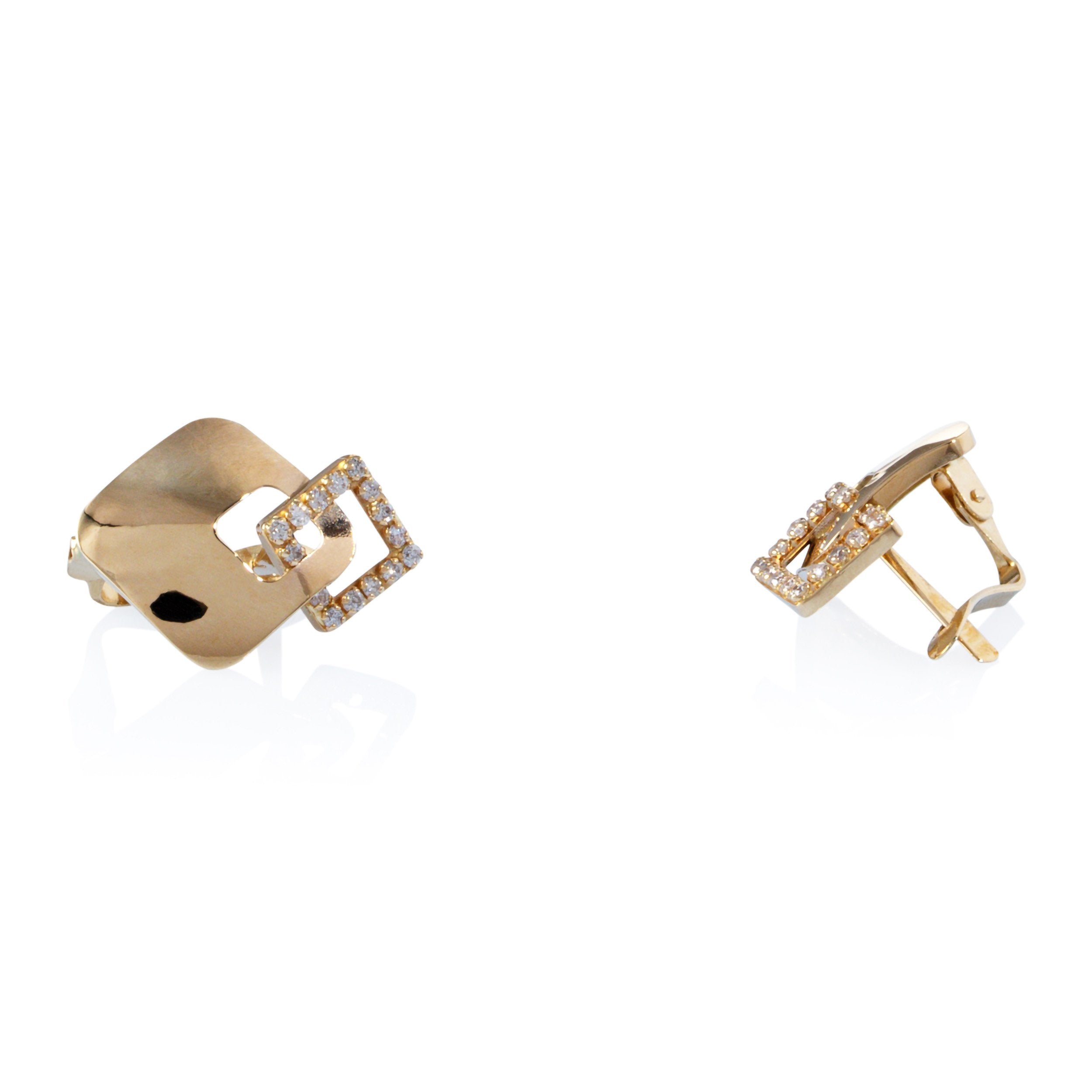 זוג עגילי זהב צהוב 14 קראט ויהלומים. יהלומים בדרגת ניקיון D ובמשקל כולל של 0.15 קראט. עיצוב העגיל בצורת מרובע אמורפי צר משובץ באבנים, המשתלב בדיסקית מרובעת אסימטרית. עגילים יפהפיים ומיוחדים מאוד.